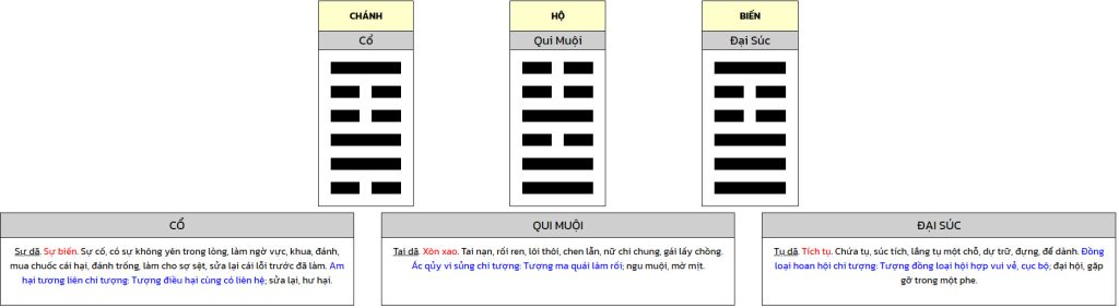 Ứng nghiệm ở đây là ông Quang Đại, người giữ nhà thờ có số năm lâu nhất, ứng Quẻ Đại Súc. Cổ là chỉ cổ xưa, nhà cổ. Vì vậy bạn học Dịch chớ chết nghĩa, thấy Quẻ Cổ, Quẻ Qui Muội là vội sợ vì thường là chuyện không may mắn.