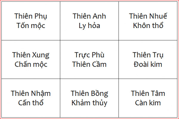 Chín sao tức là thiên bồng, thiên nhuế, thiên xung, thiên phụ, thiên cầm, thiên tâm, thiên trụ, thiên nhậm, thiên anh, chín sao được suy ra từ cửu cung của lạc thư. Nó cũng có sẵn những đặc tính âm dương ngũ hành của cửu cung bát quái.