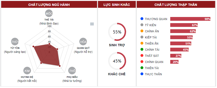 – Thuỷ vượng chủ thông minh chu đáo, tận tình. Nếu quá vượng tất sẽ nóng vội, giàu trí tưởng tượng và tinh thần trách nhiệm